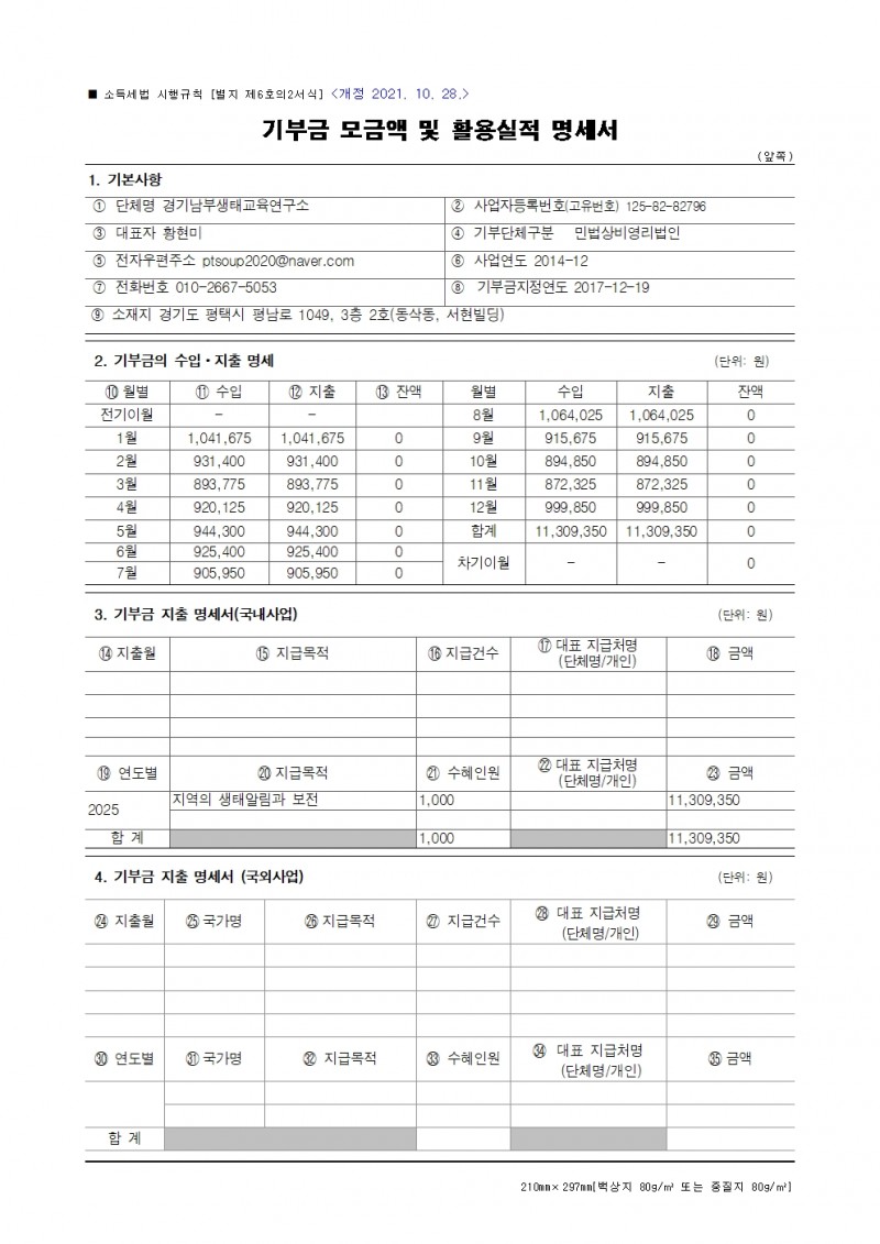 2025 연간 기부금 모금액 및 활용실적 명세서 페이지 정보 작성자 경기남부생태교육연구소 작성일26-04-07 15:09 조회20회 댓글0건 관련링크 다음글 목록 본문 댓글목록 등록된 댓글이 없습니다. 다음글 목록